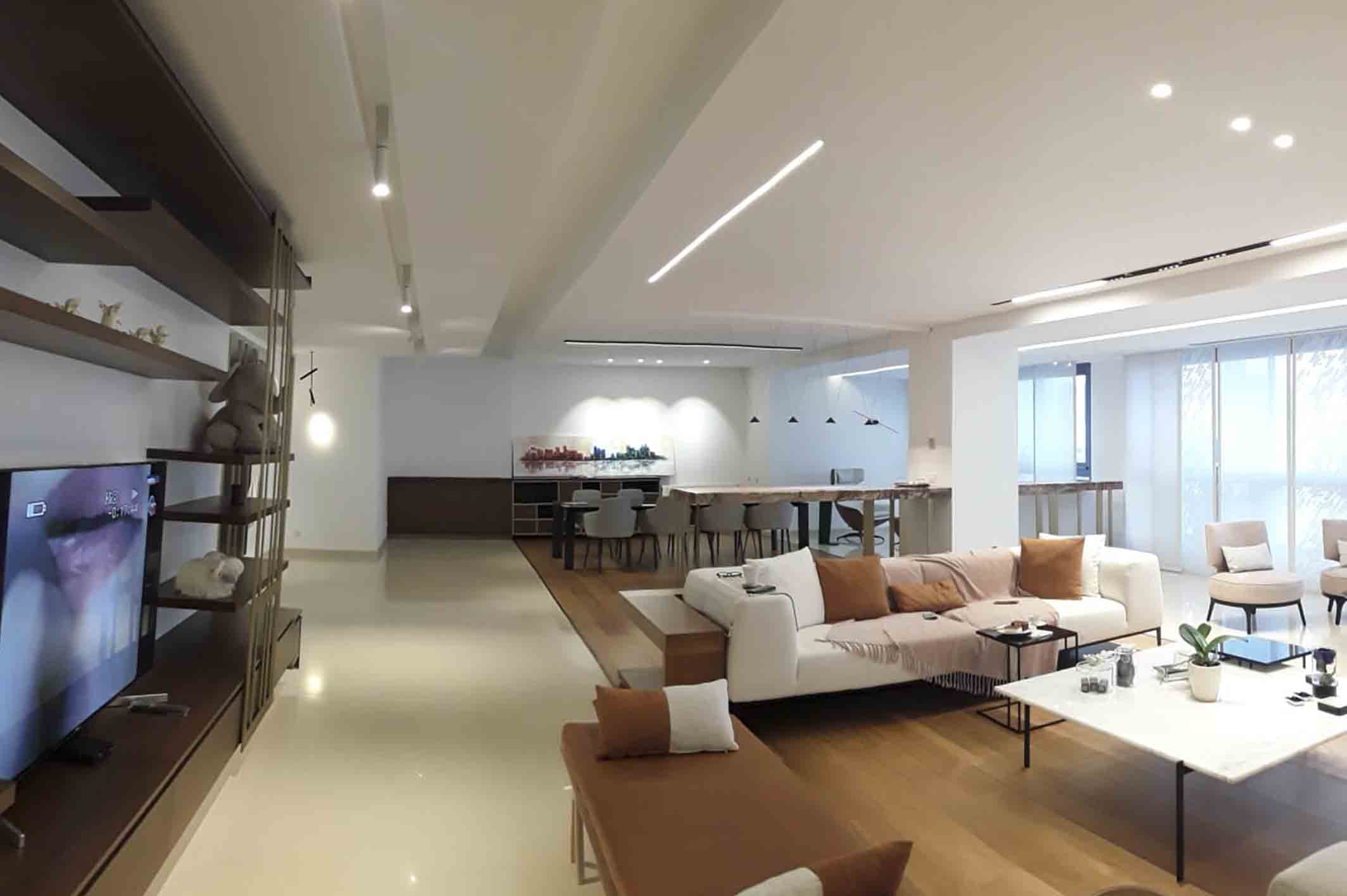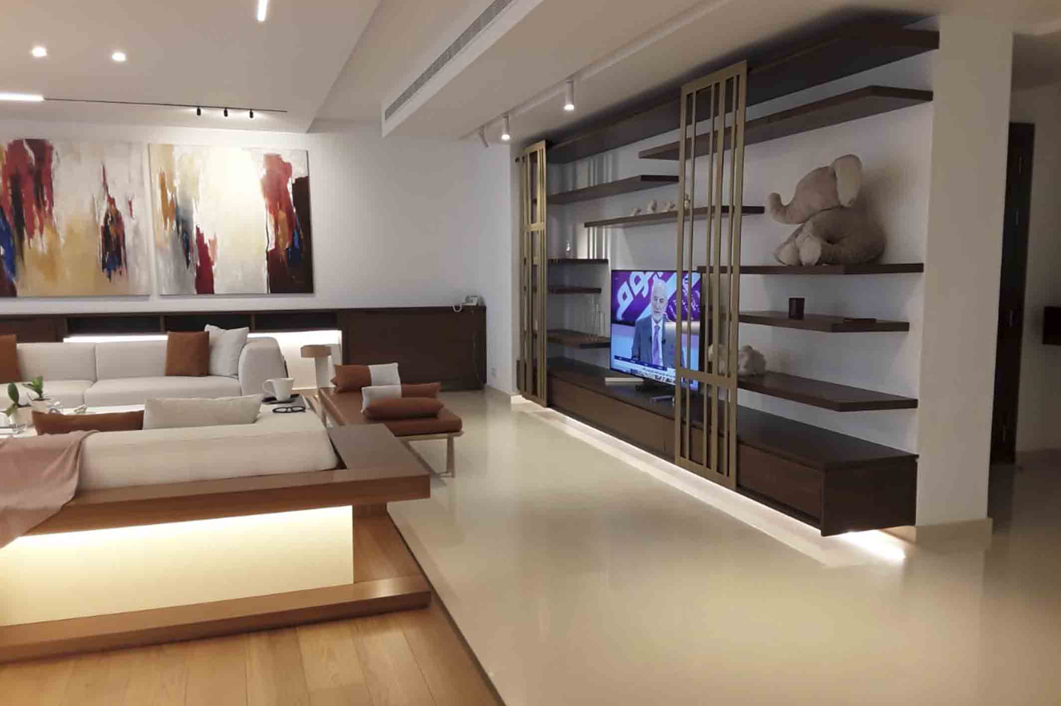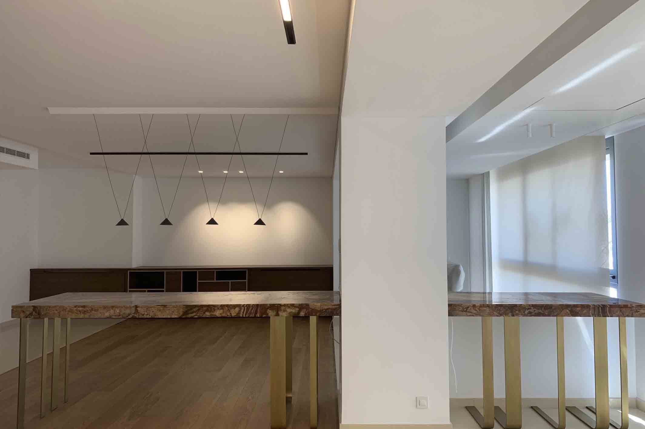 Located in Sodeco, Me Residence integrates the living space and the external space into one seamless experience that is both tranquil and striking. Continuity is created through a full-length stretch of parquet placed over the tile floor, as well as the deliberate melding of natural materials, mixing raw copper with stone and wood while also giving special attention to every detail in the space. Every element in the residence has been planned and executed to create a strong sense of relationship between them all. A play on various levels of lines in order to amplify the continuity and expanse of the space has been achieved through the crossing, arranging, and shifting of various elements such as the shelves and light fixtures. The color palette is centered on pastels, bringing an air of classical freshness to every room, while also adding a touch of femininity to the residence.