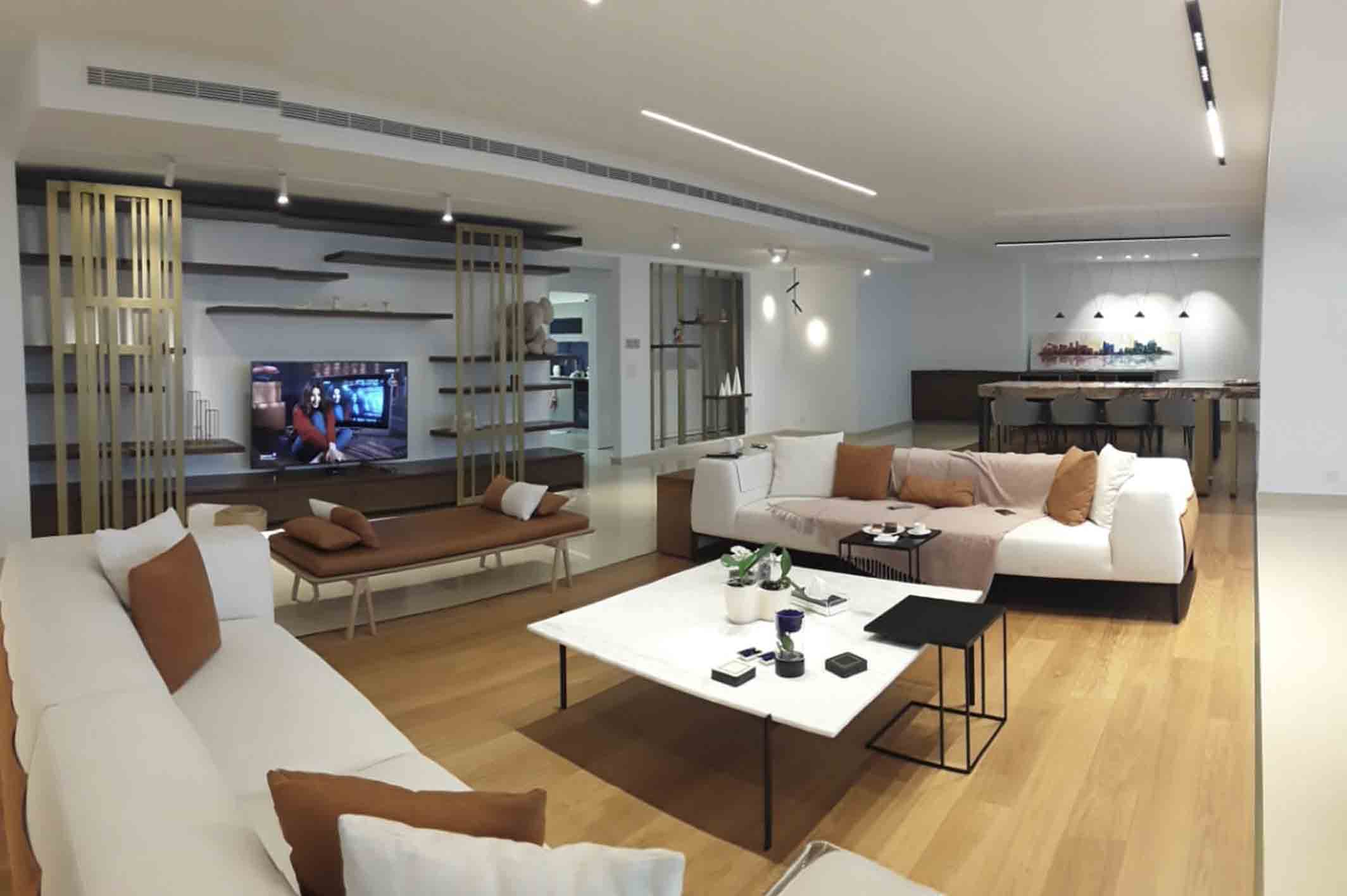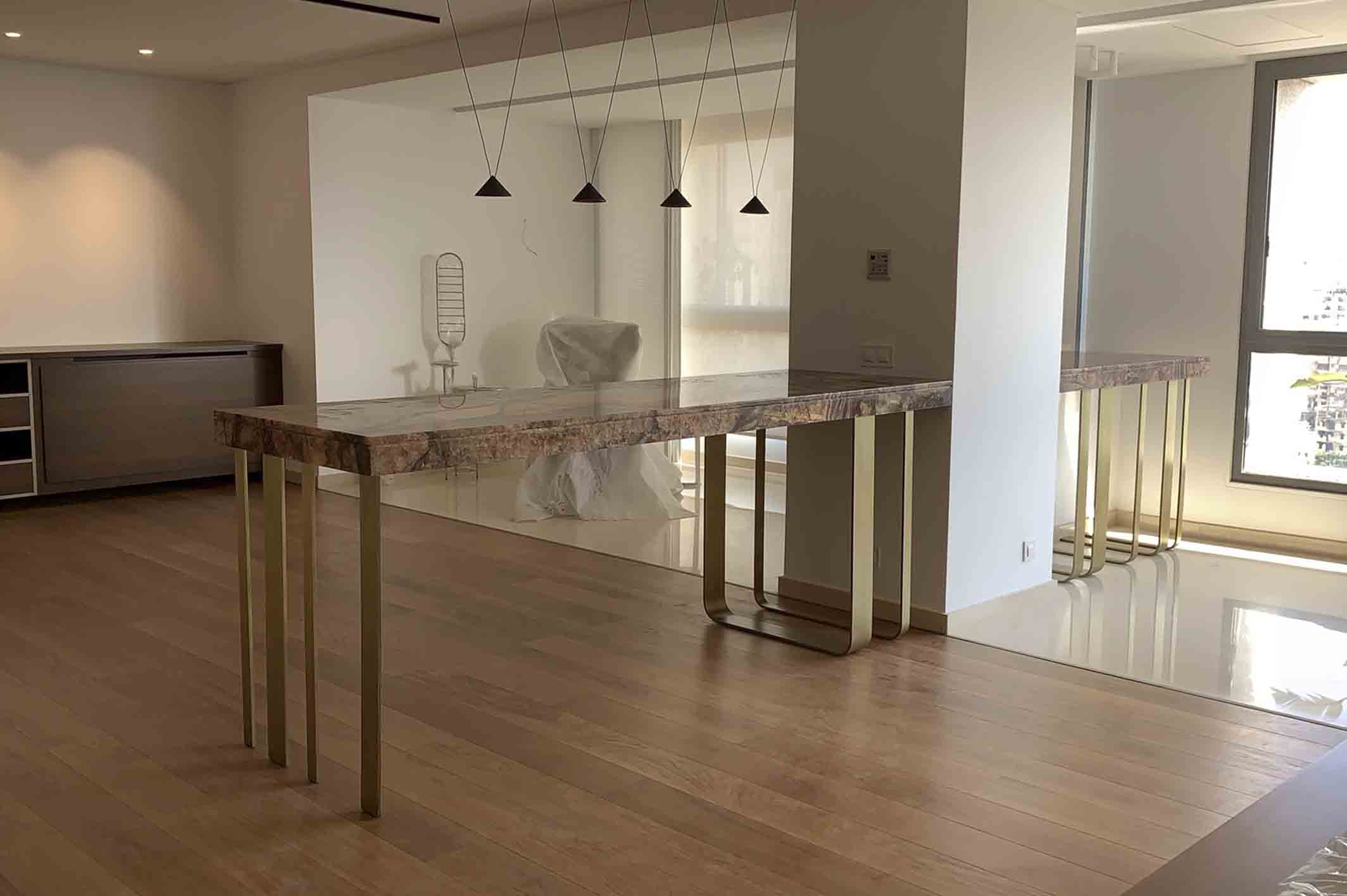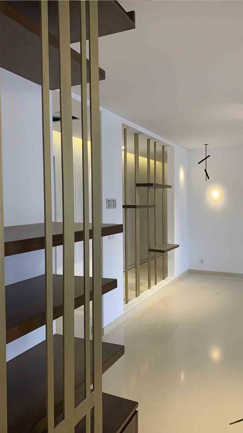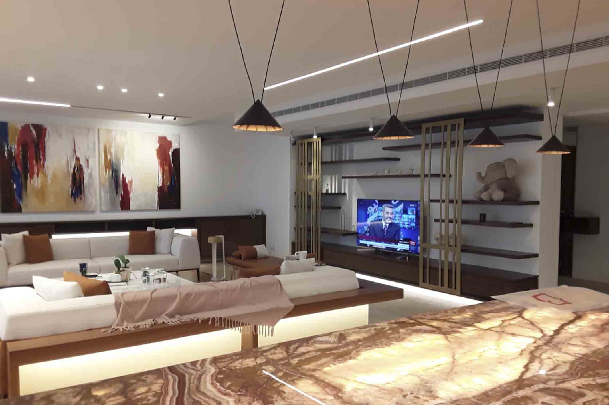 Located in Sodeco, Me Residence integrates the living space and the external space into one seamless experience that is both tranquil and striking. Continuity is created through a full-length stretch of parquet placed over the tile floor, as well as the deliberate melding of natural materials, mixing raw copper with stone and wood while also giving special attention to every detail in the space. Every element in the residence has been planned and executed to create a strong sense of relationship between them all. A play on various levels of lines in order to amplify the continuity and expanse of the space has been achieved through the crossing, arranging, and shifting of various elements such as the shelves and light fixtures. The color palette is centered on pastels, bringing an air of classical freshness to every room, while also adding a touch of femininity to the residence.