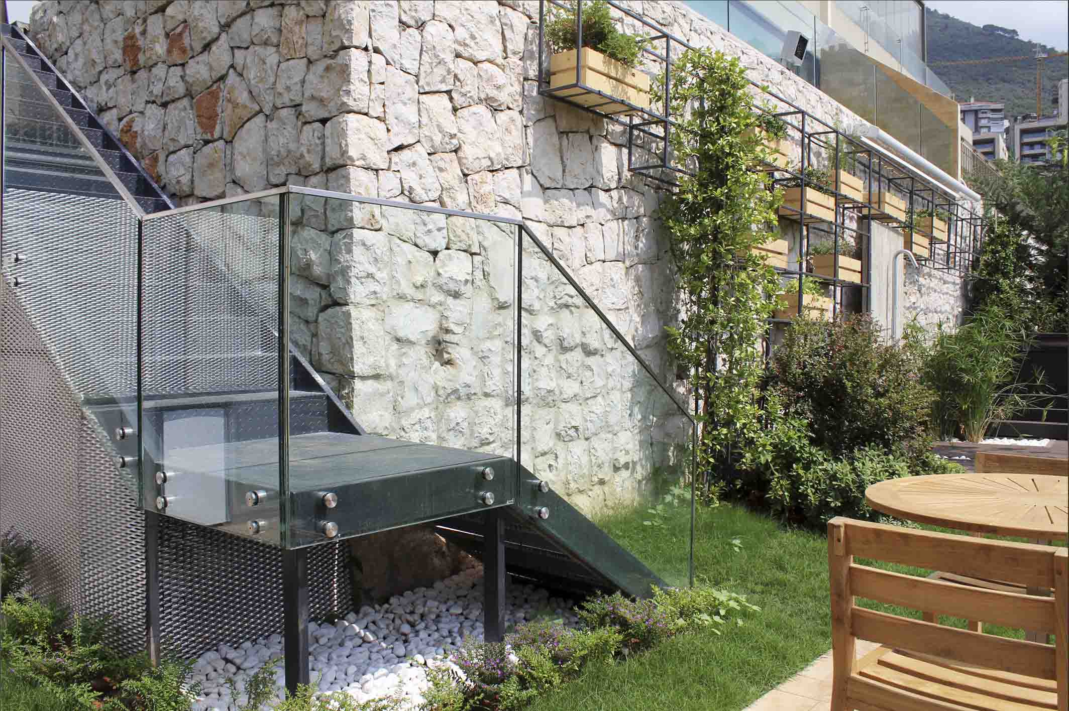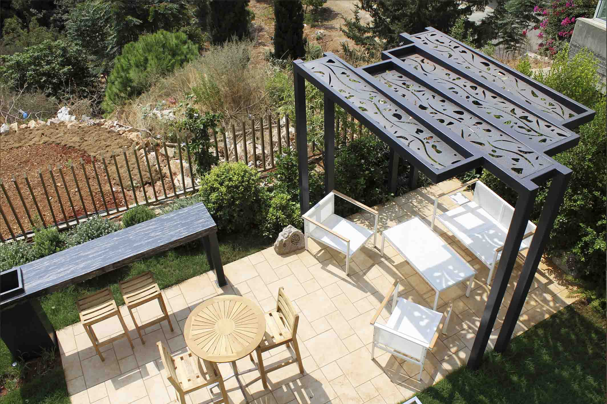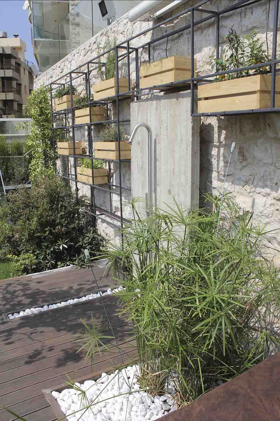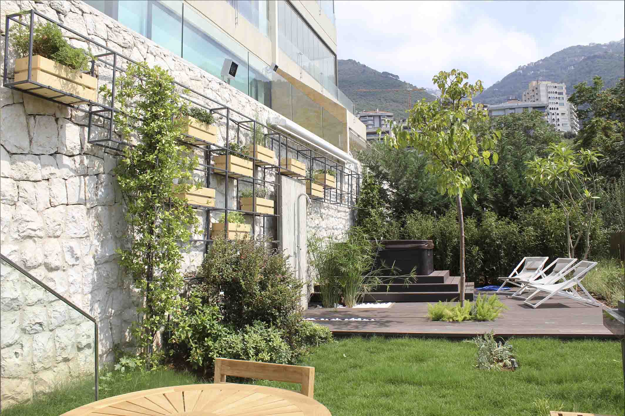 Nestled between the striking mountains of Harissa and the iconic shoreline of Jounieh, the inspiration behind this residence comes from its natural surroundings. Drawing from the levels, lines, and light on the mountains outside, the residence’s interior integrates geometric shapes and several ceiling levels, amplifying light that reflects off the floor and two-dimensional wooden wall, and giving functionality to the positive space. A one-piece, 5-meter-high window seamlessly connects the interior with a terrace that leads to a pristine stretch of green – the private garden. Hedges carefully conceal the outdoor jacuzzi and metal perforated pergolas, and completing the space is a solid, high stone wall dotted with wooden boxes within a metal grid, home to the residence’s vertical vegetable garden.
