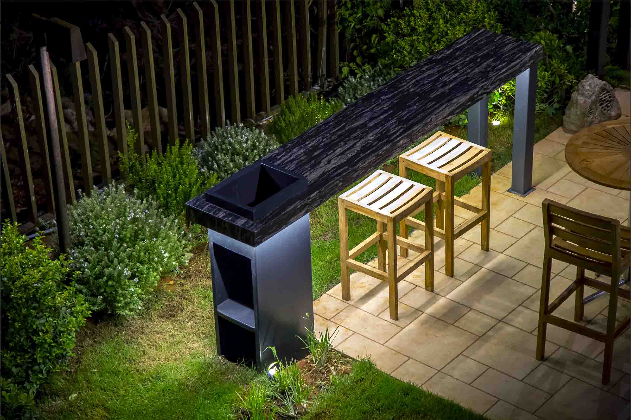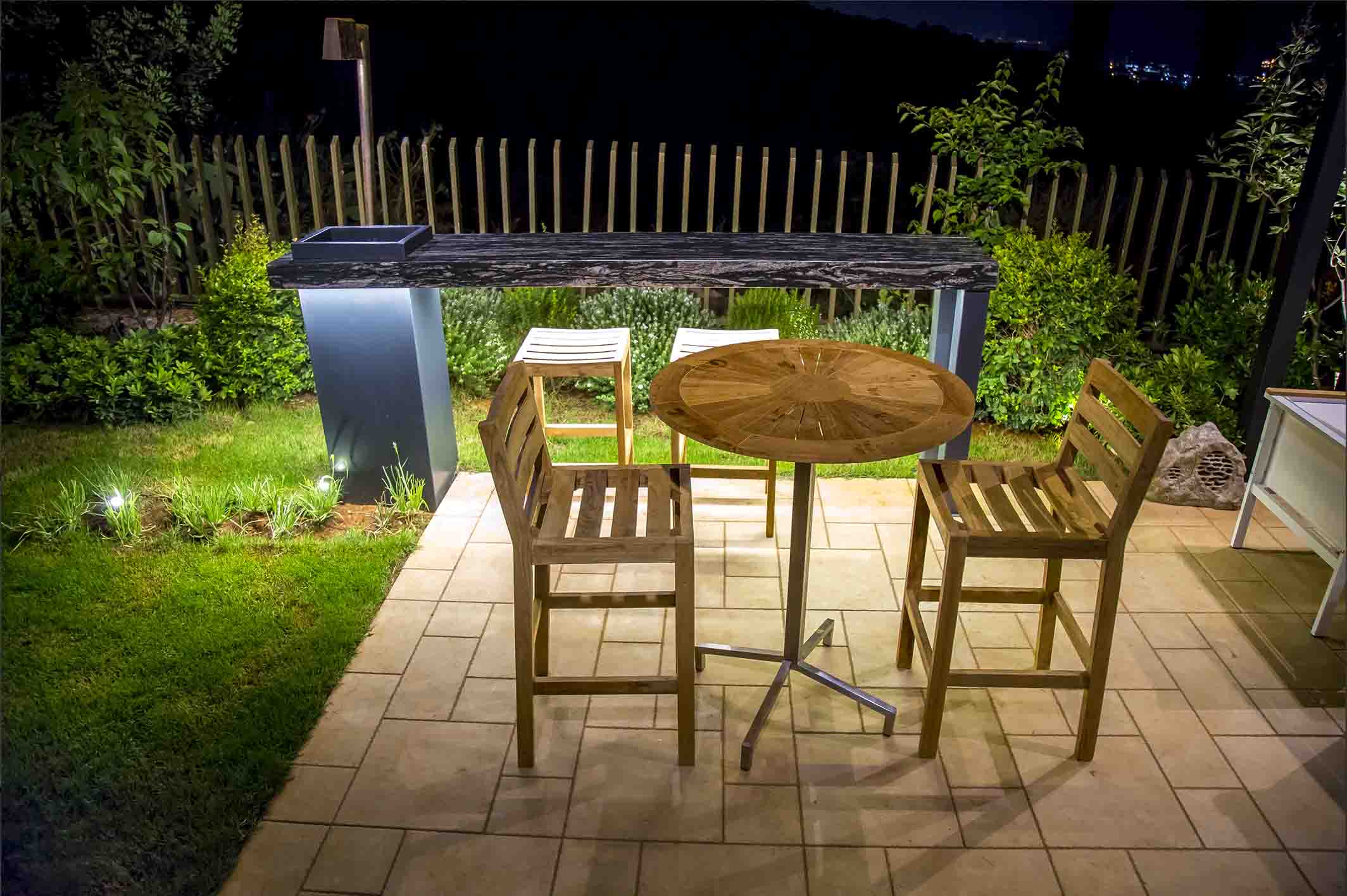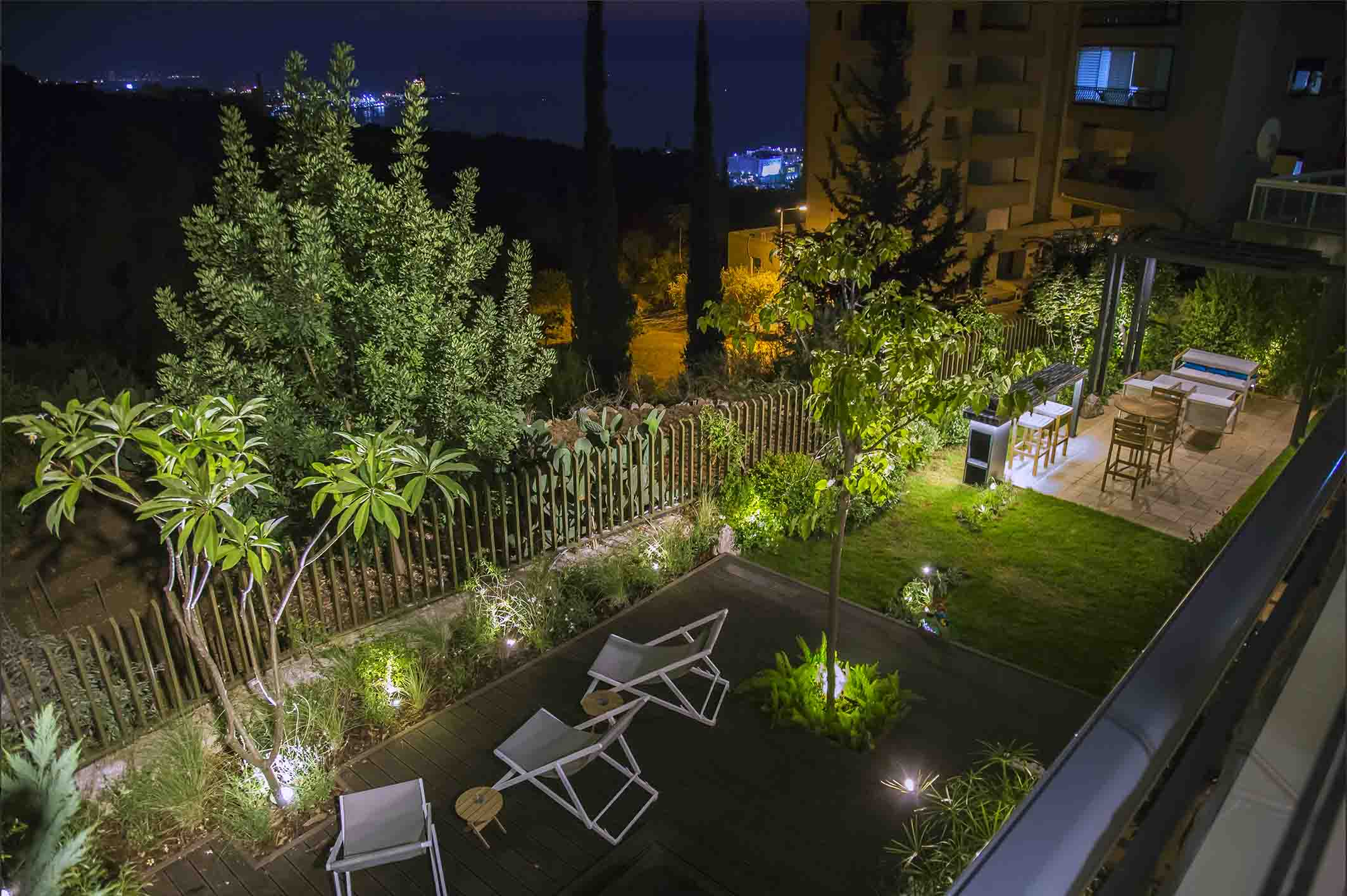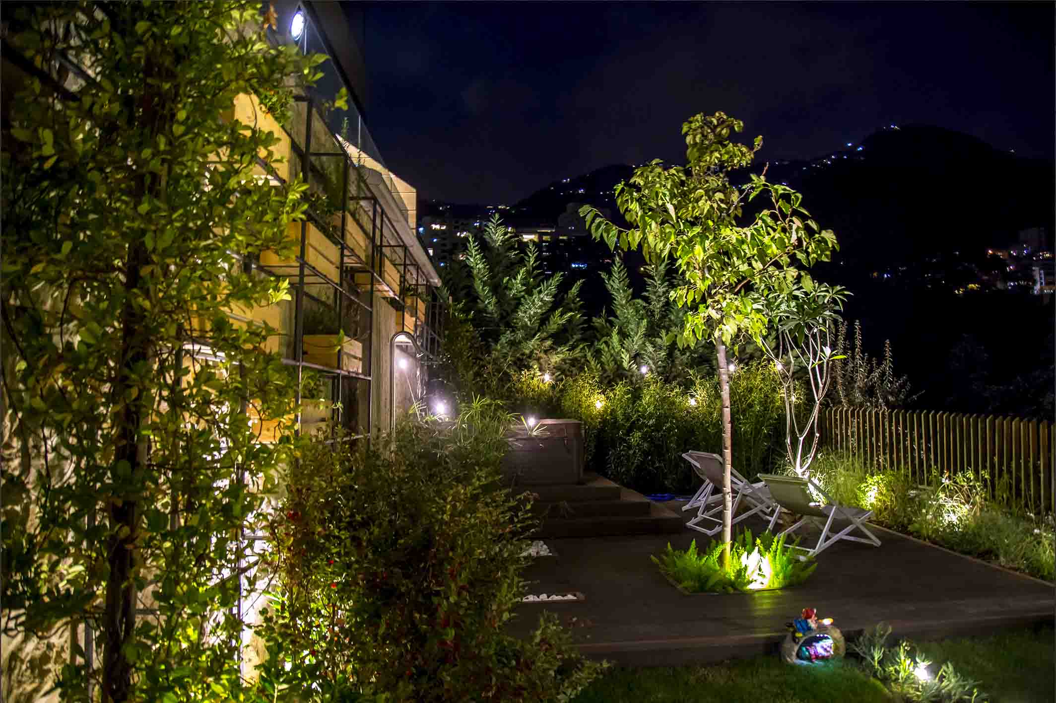 Nestled between the striking mountains of Harissa and the iconic shoreline of Jounieh, the inspiration behind this residence comes from its natural surroundings. Drawing from the levels, lines, and light on the mountains outside, the residence’s interior integrates geometric shapes and several ceiling levels, amplifying light that reflects off the floor and two-dimensional wooden wall, and giving functionality to the positive space. A one-piece, 5-meter-high window seamlessly connects the interior with a terrace that leads to a pristine stretch of green – the private garden. Hedges carefully conceal the outdoor jacuzzi and metal perforated pergolas, and completing the space is a solid, high stone wall dotted with wooden boxes within a metal grid, home to the residence’s vertical vegetable garden.