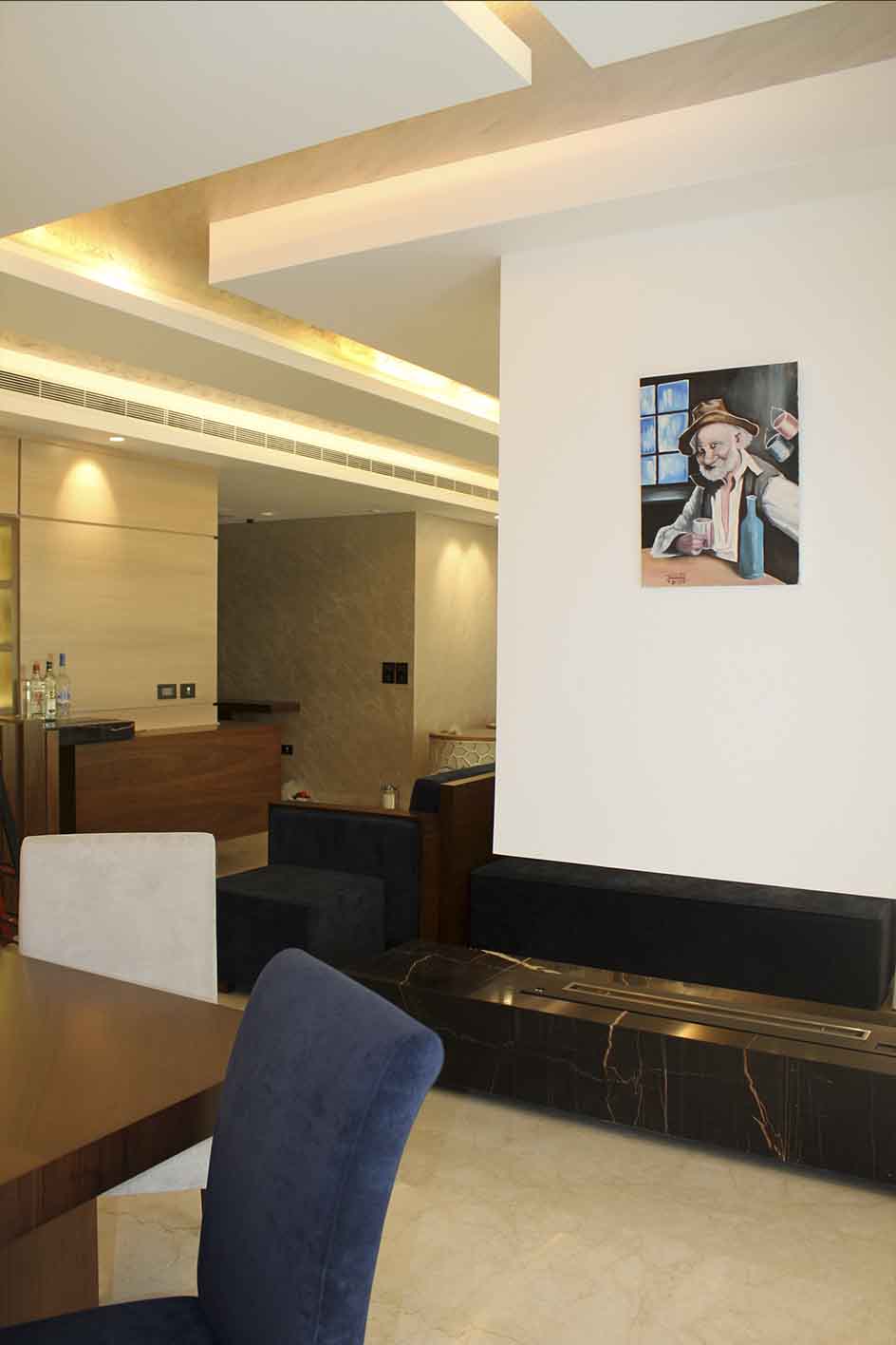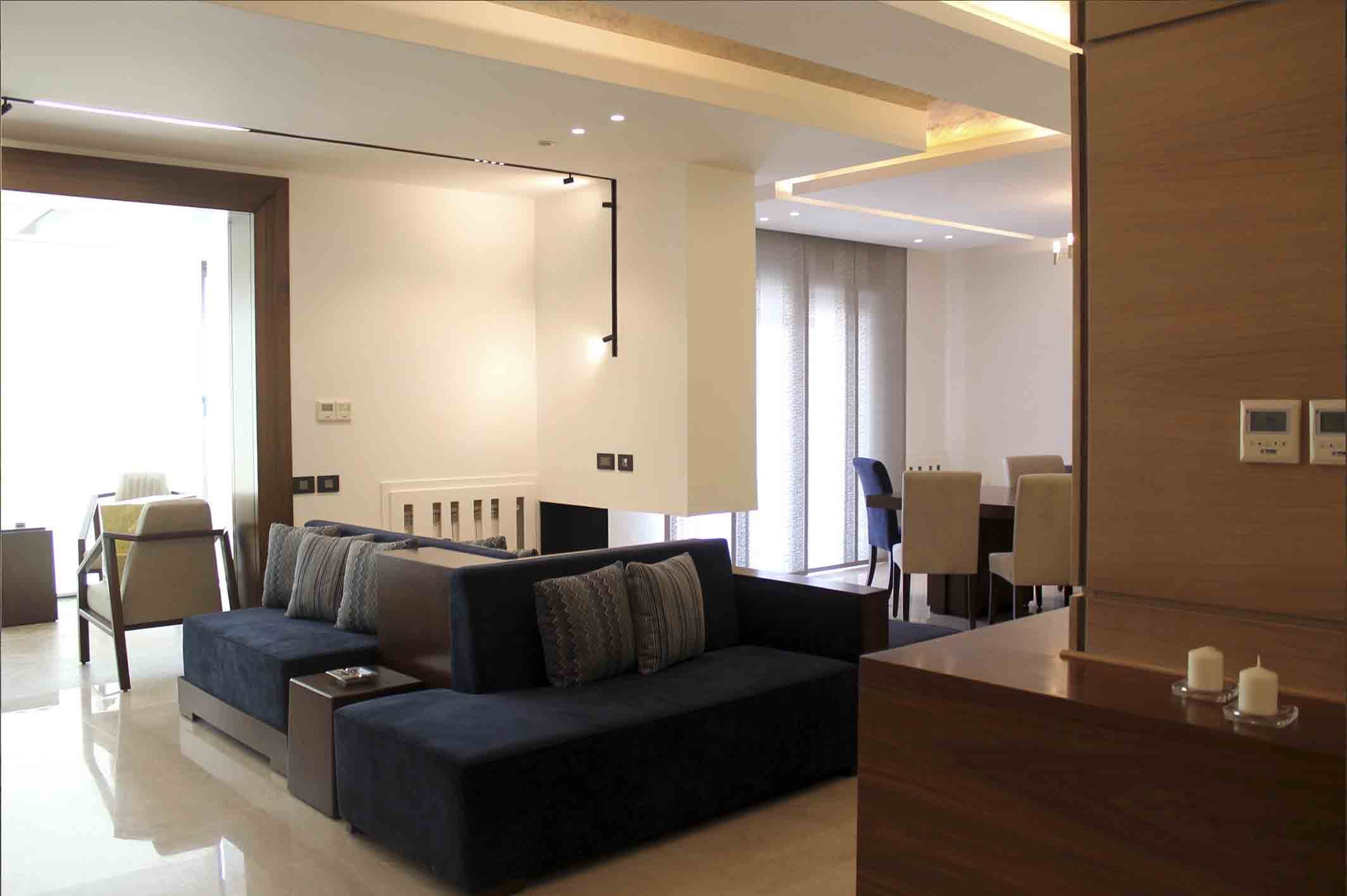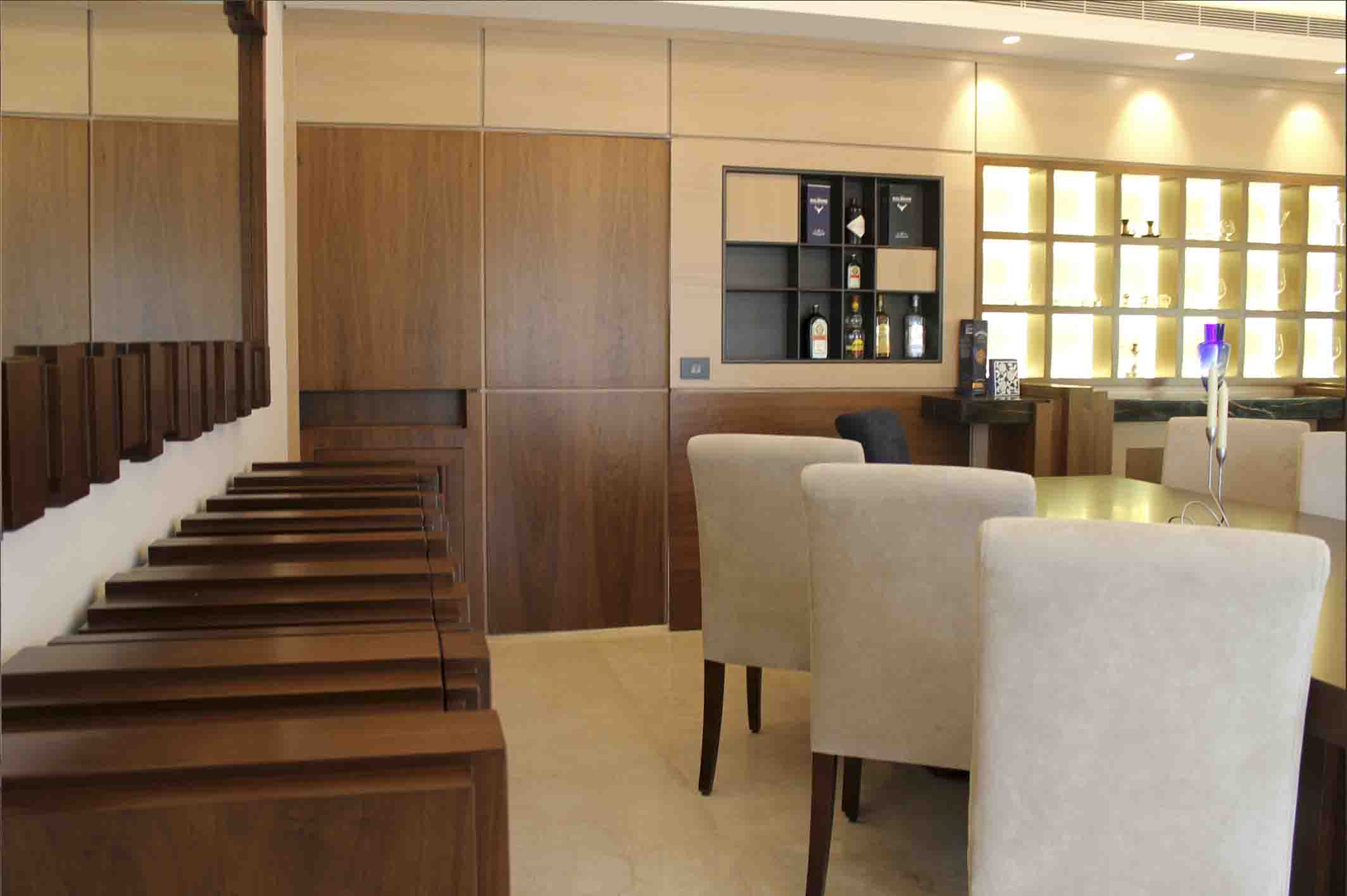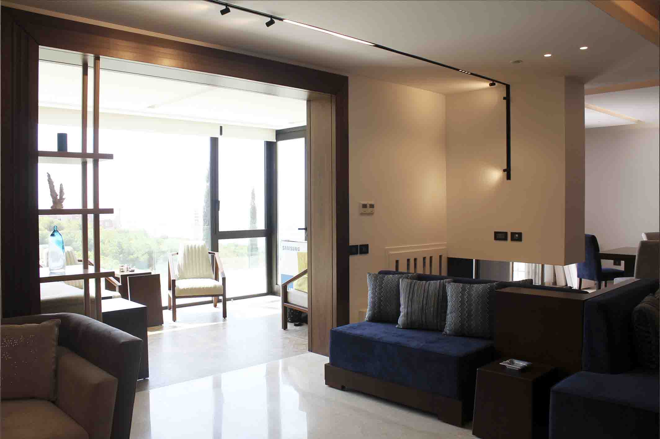 Nestled between the striking mountains of Harissa and the iconic shoreline of Jounieh, the inspiration behind this residence comes from its natural surroundings. Drawing from the levels, lines, and light on the mountains outside, the residence’s interior integrates geometric shapes and several ceiling levels, amplifying light that reflects off the floor and two-dimensional wooden wall, and giving functionality to the positive space. A one-piece, 5-meter-high window seamlessly connects the interior with a terrace that leads to a pristine stretch of green – the private garden. Hedges carefully conceal the outdoor jacuzzi and metal perforated pergolas, and completing the space is a solid, high stone wall dotted with wooden boxes within a metal grid, home to the residence’s vertical vegetable garden.