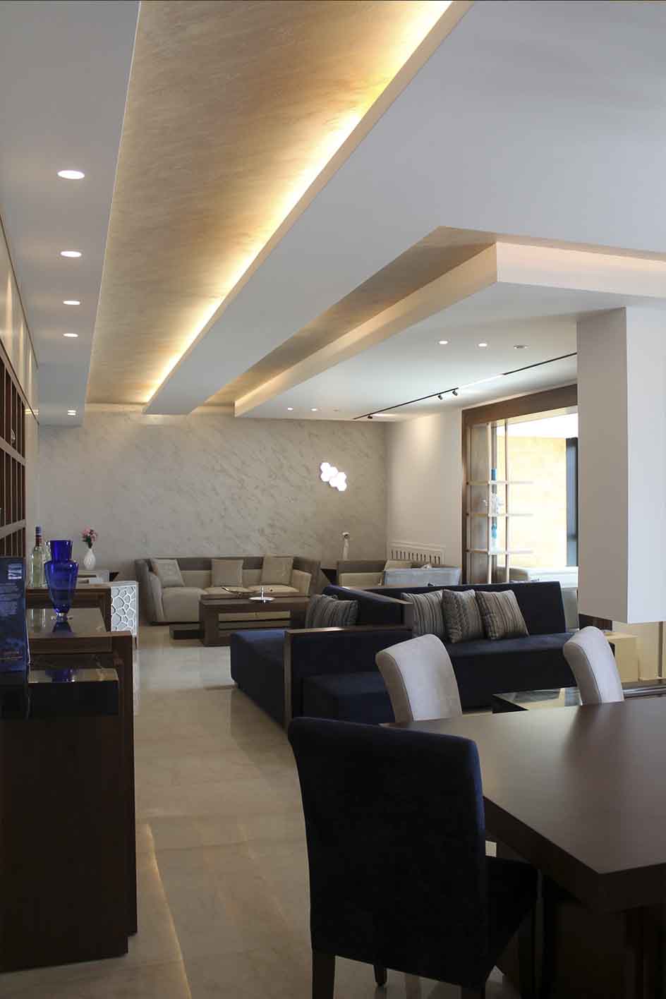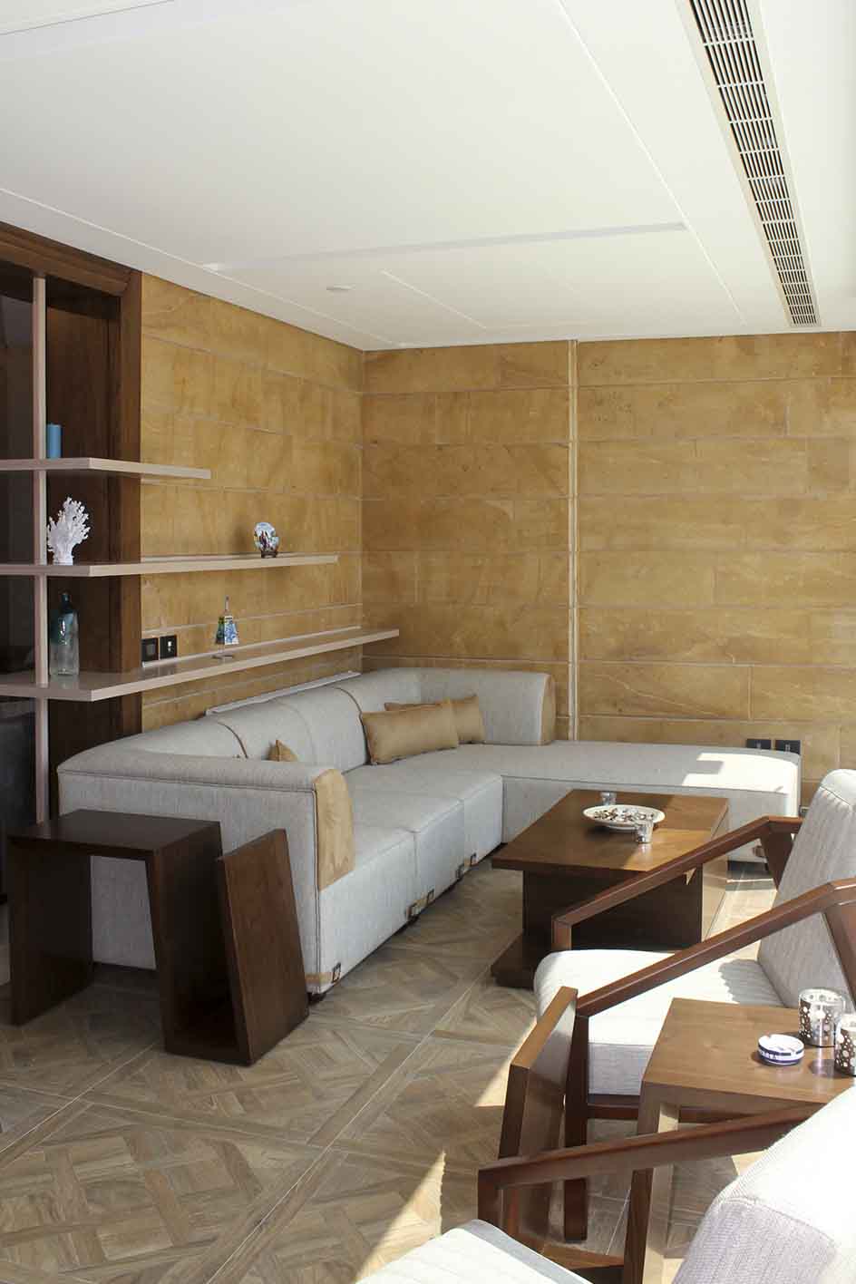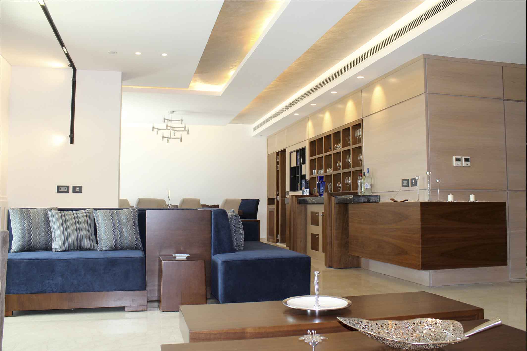 Nestled between the striking mountains of Harissa and the iconic shoreline of Jounieh, the inspiration behind this residence comes from its natural surroundings. Drawing from the levels, lines, and light on the mountains outside, the residence’s interior integrates geometric shapes and several ceiling levels, amplifying light that reflects off the floor and two-dimensional wooden wall, and giving functionality to the positive space. A one-piece, 5-meter-high window seamlessly connects the interior with a terrace that leads to a pristine stretch of green – the private garden. Hedges carefully conceal the outdoor jacuzzi and metal perforated pergolas, and completing the space is a solid, high stone wall dotted with wooden boxes within a metal grid, home to the residence’s vertical vegetable garden.